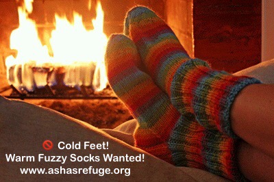 Every year on my birthday, today (November 30th), I am reminded of the many clients we serve that have few to no warm socks on their feet during the colder winter days.  I am especially tender hearted thinking of the elderly men and women with poor circulation and freezing cold toes, feet and ankles!!  Ask my family, I am a true whiny wimp when it comes to cold weather and my feet getting cold. Once my feet are cold it seems like forever before I can get them to warm up.  I always enjoy slipping on a cozy pair of my fluffy, fuzzy socks, grabbing my journal or a good book and sipping on warm chai tea.