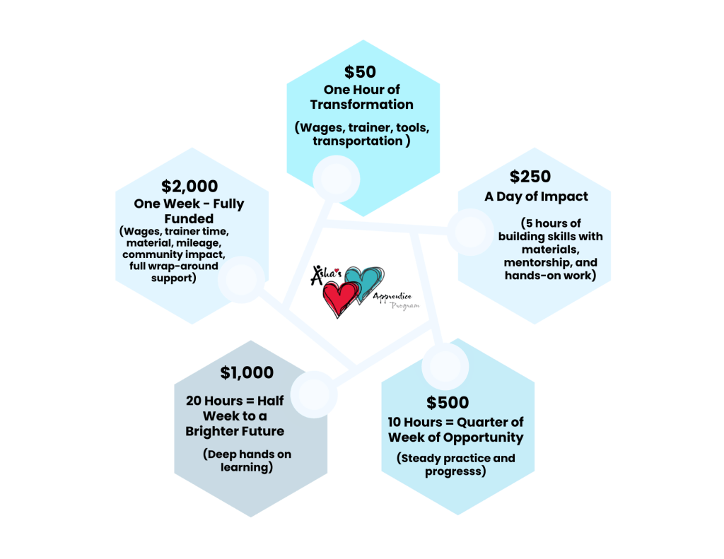 Our Apprentice Program is the heart of Asha’s Refuge, offering 10–40 hours a week of paid training, mentoring, and skill-building that prepares refugees and lawfully present newcomers for jobs with us or in the wider community. It’s a ripple of hope: those who once arrived as refugees now guide and support the newest arrivals. Every hour you fund covers wages, mentorship, tools, and transportation — turning survival into stability.